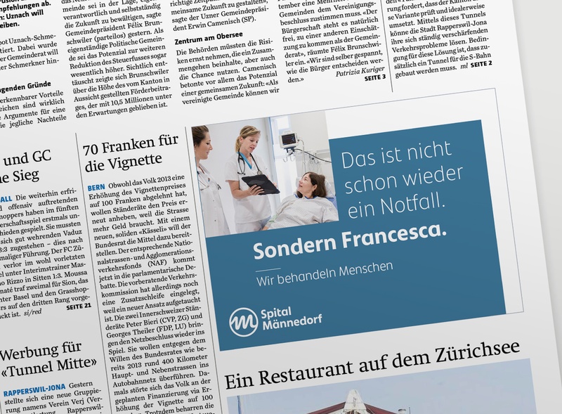 Das Spital Männedorf hat sich von einem Regionalspital zu einem vernetzten Gesundheitspartner weiterentwickelt. Im Rahmen des Corporate Designs, das wir für das Spital entwickeln durften, haben wir eine Imagekampagne umgesetzt, die den Menschen in den Mittelpunkt stellt.